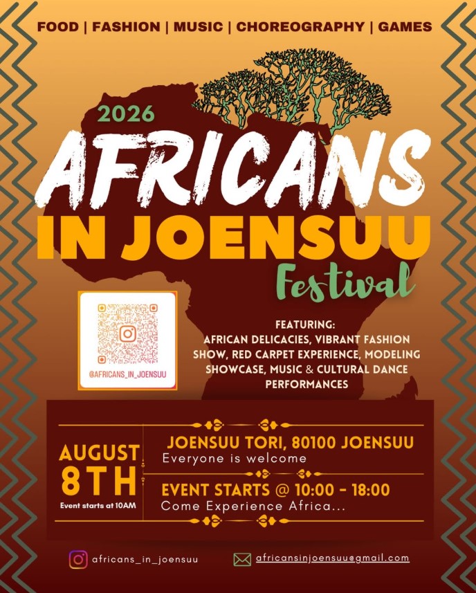 8.8.Africans in Joensuu -festivaali TAPAHTUMA- Julkaistu 26.3.2026 harjoittelija Africans in Joensuu -toritapahtuma lauantaina 8.elokuuta.2026!Lue lisää: InstagramFacebook